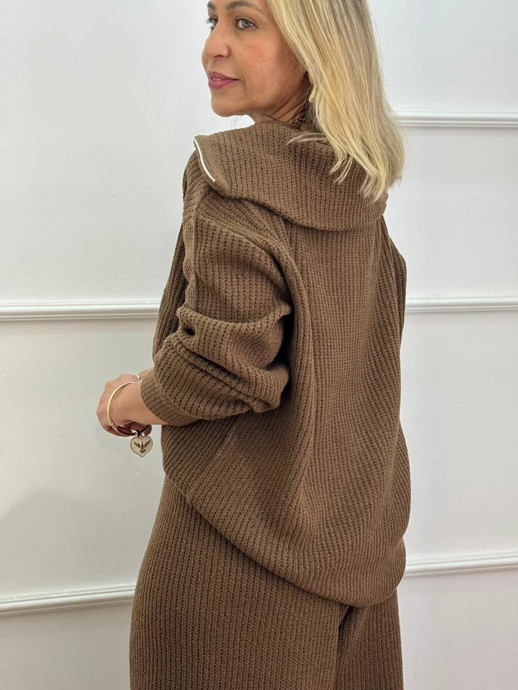 A blusa com fechamento em zíper e manga comprida traz praticidade e elegância ao look, enquanto a calça com cós ajustável se adapta ao corpo com conforto e sofisticação.