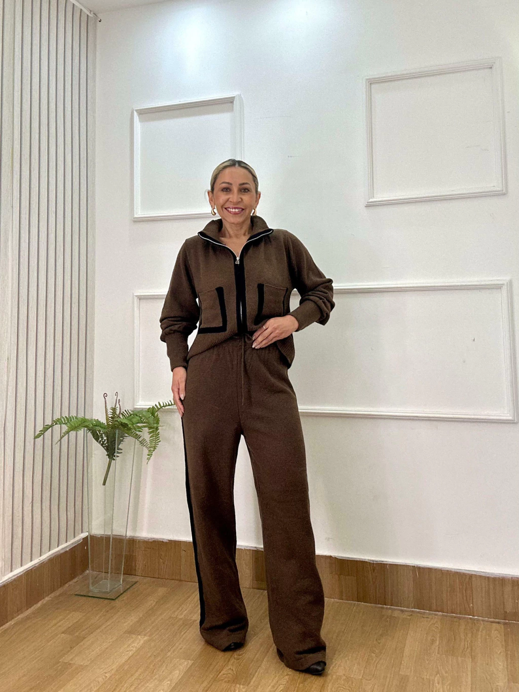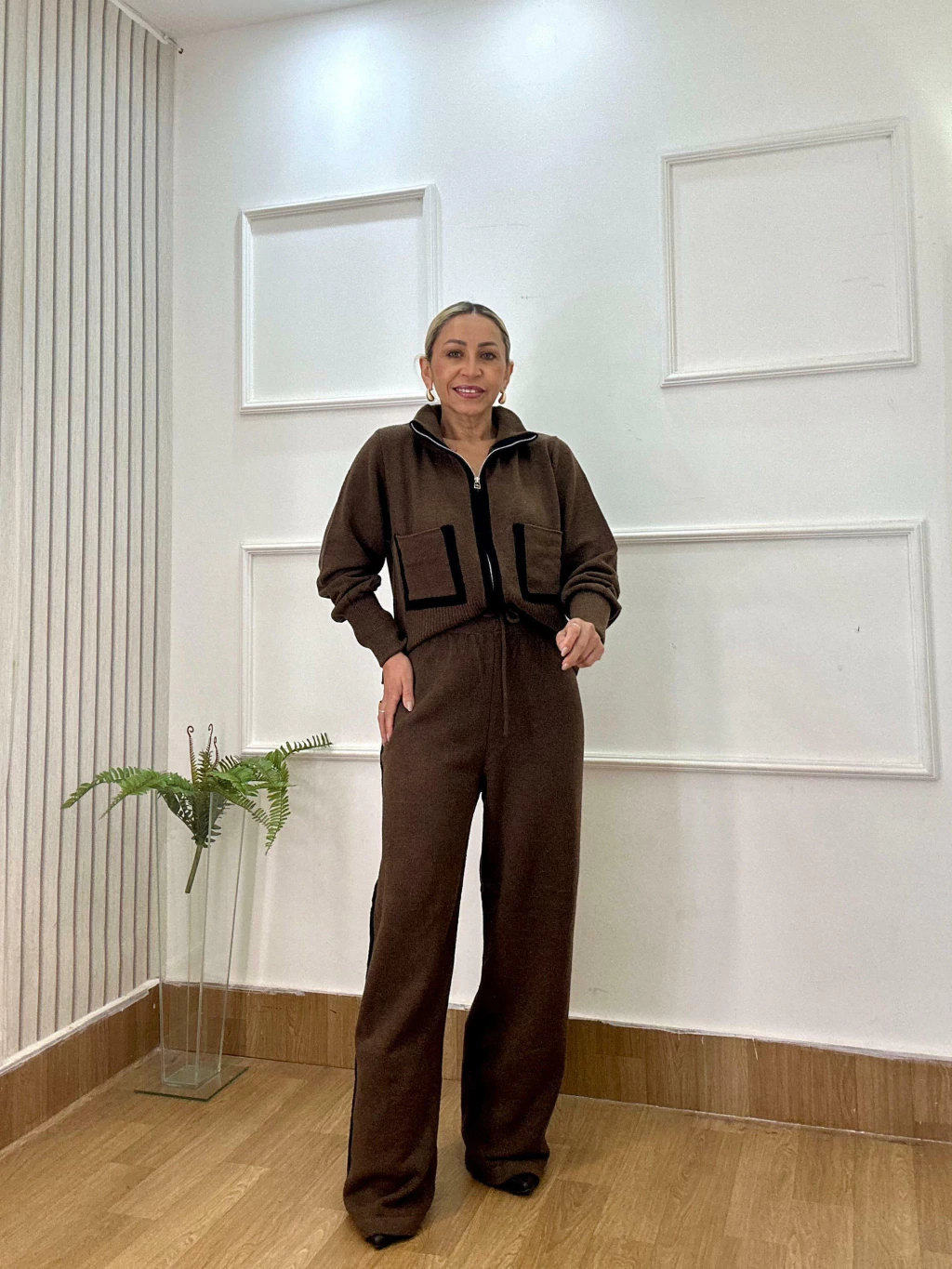 A blusa com fechamento em zíper frontal, mangas longas e bolsos frontais traz um visual moderno e utilitário, enquanto a calça possui ajuste na cintura e detalhes em preto nas laterais, adicionando um toque esportivo-chique à produção.